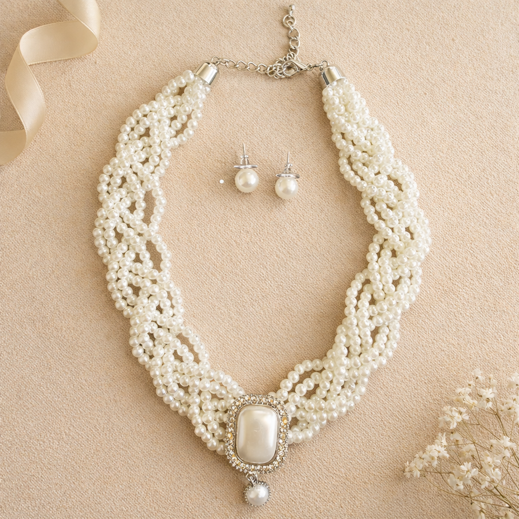Elegance, redefined. This luxurious multi-layer pearl set is designed to captivate, featuring cascading strands of luminous pearls, a statement centerpiece framed with delicate sparkle, and matching earrings for a complete, refined look.